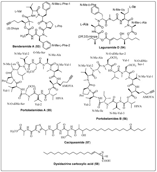 Lagunamide D (54), a natural macrocyclic depsipeptide, was isolated from a collection of marine cyanobacteria (Dichothrix sp., Lyngbya sp., Ceramium sp., and Rivularia sp.). It showed significant antiproliferative activity against human lung adenocarcinoma using A549 as an in-vitro model. Compound (54) exhibited IC50 values of 7.1 ± 1.7 nM. The mechanism of action needs further investigation [64]. Another study reported two secondary metabolites: Portobelamide A and B (55 and 56), purified from the marine cyanobacteria Caldora sp. Two compounds were evaluated as anticancer using H-460 cells. The findings of compound (55) showed 33% survival at a concentration of 0.9 μM [23]. Another carboxylic acid named Dysidazirine carboxylic acid (58) was isolated from marine cyanobacteria Caldora sp. by Gunasekera and co-authors (2022). The anticancer activity was evaluated against human colon cancer cells (HCT116) in-vitro. Compound (58) shows an acceptable effect with IC50 values of 79.7 μM, in comparison with the positive control (Gatorbulin-1 with IC50 values of 0.8 μM) [25]. Finally, we conclude that in-deep studies require potent bioactive compounds shown in Table 4, structured in Scheme 4 and their spectral analysis reviewed in Table S4 that may be lead compounds for anticancer drugs.