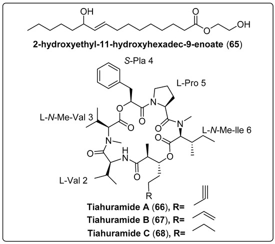 - Levert, A.; Alvariño, R.; Bornancin, L.; Abou Mansour, E.; Burja, A.M.; Genevière, A.-M.; Bonnard, I.; Alonso, E.; Botana, L.; Banaigs, B. Structures and Activities of Tiahuramides A–C, Cyclic Depsipeptides from a Tahitian Collection of the Marine Cyanobacterium Lyngbya majuscula. J. Nat. Prod. 2018, 81, 1301–1310. [Google Scholar] [CrossRef] [PubMed]