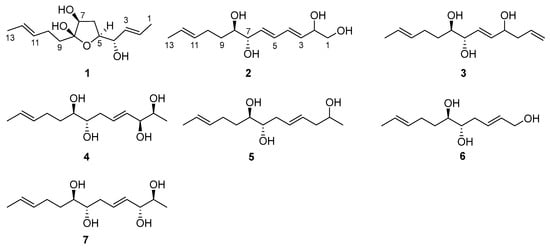 The organic extracts of marine-derived Trichoderma sp. Z43 isolated from the marine brown alga Dictyopteris divaricata were subjected to a series of column chromatography processes to produce six new lipids, namely, trichoderols B-G (1–6), along with a known one, triharzianin B (7) (Figure 1). Compound 7 was unambiguously identified by comparing its NMR data and specific rotation value with those reported in the literature [19].