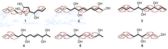 Key COSY and HMBC correlations of 1–6 (bold lines for COSY and arrows for HMBC).