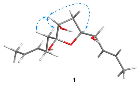 Compound 1 was isolated as a colorless oil with a molecular formula of C13H22O4 established by HRESIMS (m/z 265.1420 [M + Na]+), implying three degrees of unsaturation. The 1H NMR spectrum (Table 1) showed two methyl doublets, one double quartet, one double doublet, and two multiplets assignable to four olefinic protons and one double multiplet and two double doublets attributable to three oxymethines. The 13C NMR and DEPT spectra (Table 2) displayed the presence of two methyls, three methylenes, seven methines, and one nonprotonated carbon. COSY correlations of H-1/H-2/H-3/H-4/H-5/H-6/H-7 established the linkage of C-1 to C-7 (Figure 2). A pentenyl group was confirmed by the COSY correlation of H-9 with H-10 and the HMBC correlations from H-10/H-13 to C-11 and C-12 and from H-9 to C-11, which was then elongated to C-7 via C-8 by the HMBC correlations from H-6/H-9 to C-8. To satisfy the molecular formula, an ether linkage was situated between C-5 and C-8, which was verified by the HMBC correlation from H-5 to C-8 (Figure 2). Thus, the planar structure of 1 was validated. The double bond at C-2 was attributed to be trans by the large coupling constant (J = 15.2) between H-2 and H-3. The chemical shifts of other two olefinic carbon atoms (C-11, δC 130.9; C-12, δC 125.5) were highly similar to those of triharzianin B (7) (C-11, δC 130.9; C-12, δC 124.6) [19], suggesting a trans configuration of the C-11 double bond, which was further verified by the IR absorption at 969 cm−1. The relative configurations of H-5, OH-7, and OH-8 were confirmed by NOESY correlations of H-7 with H-5 and H-9 (Figure 3), and the relationship of H-4 and H-5 was deduced to be threo due to NMR data that were similar to those of (-)-(S)-1-[(2S,5S)-5-[2-propenyl]tetrahydrofuran-2-yl]prop-2-en-1-ol [22].