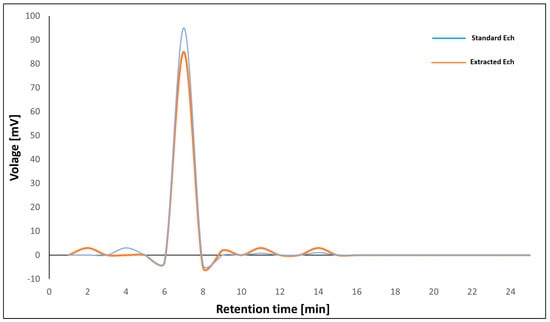 As illustrated in Figure 1, the HPLC analyses of separated Ech showed a notable peak with a retention period of 7.11 min, which is the same as the standard Ech with a total concentration of 85.5%.