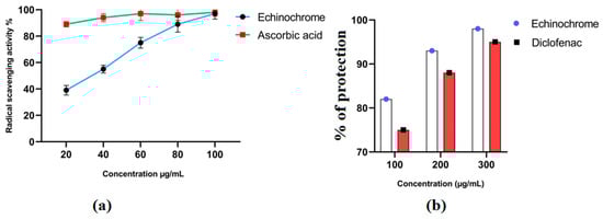 In vitro studies confirmed the antioxidant and anti-inflammatory properties of Ech. Ech’s antioxidant properties were dose-dependent (Figure 2a). The anti-inflammatory activity of Ech was validated by its ability to protect the membrane of red blood cells from heat-induced hemolysis at a range of concentrations (Figure 2b).