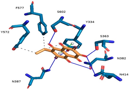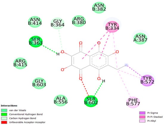 Grid box dimensions in Table 1 were used in the docking of Ech to Keap1. The docking score of Ech binding with Keap1 was −7.9 kcal/mol. Ech three-dimensional visualization showcased several favorable interactions in the binding site of the target protein, including several hydrogen bonds, hydrophobic interactions, and π-stacking. Visualization of the protein–ligand complex revealed a total of six hydrogen bonds with target residues Y334, S363, N382, N387, N414, and S602; it exhibited strong hydrophobic interactions with Y334, Y572, and F577. Ech’s aromatic ring forms π–π stacking with the aromatic ring of Y334 (Figure 3). Two-dimensional visualization of the protein–ligand complex confirmed the three-dimensional results (Figure 4). Ech formed two hydrogen bonds with residues S363 and S602 in addition to seven hydrophobic interactions with residues R380, N382, N387, N414, R415, A556, and G603. Pi-stacking was also present between the aromatic rings of Ech and Y334.