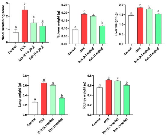 The effect of Ech on nasal scratching, lung, liver, kidney, and spleen weights. Values are given as means for 8 mice in each group ± standard error of the mean (SEM). The value that does not share a common letter superscript is significantly different (p < 0.05).