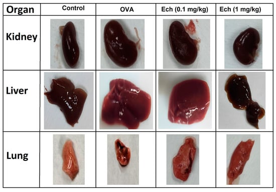 The lung, liver, spleen, and kidney weights in OVA-challenged animals increased significantly compared to control animals. Remarkably, treatment with Ech (1 mg/kg) significantly (p > 0.05) improved the weight of the organs (Figure 5). Moreover, the OVA group had a significantly (p < 0.05) higher nasal scratching score than the control groups. Compared to the OVA group, the nasal scratching score significantly decreased after treatment with the high dose of Ech. The overall organ morphologies are represented in Figure 6.