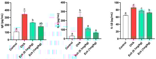 The effect of Ech on the serum levels of IgE, IL-4, and IL-1β. Values are given as means for 8 mice in each group ± standard error of the mean (SEM). The value that does not share a common letter superscript is significantly different (p < 0.05).