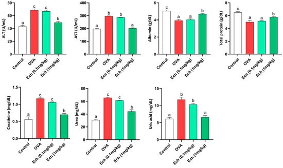The effect of Ech on the liver functions parameters (AST, ALT, total protein, and albumin) and kidney function parameters (creatinine, urea, and uric acid). Values are given as means for 8 mice in each group ± standard error of the mean (SEM). The value that does not share a common letter superscript is significantly different (p < 0.05).