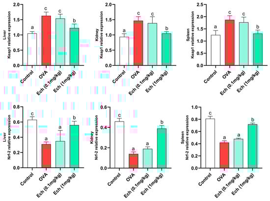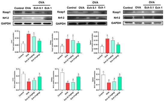 To further evaluate the therapeutic effect of Ech, we measured the expression of Keap1 and Nrf2 in the liver, kidney, and spleen (Figure 9). In the OVA group, Keap1 expression was considerably upregulated (p < 0.05), but Nrf2 expression was significantly downregulated (p < 0.05). Keap1 protein levels were significantly decreased, and Nrf2 levels were significantly increased after administering Ech (high dose). These findings suggested that Ech could regulate the Keap1/Nrf2 signaling pathway with anti-inflammatory and antioxidant properties.