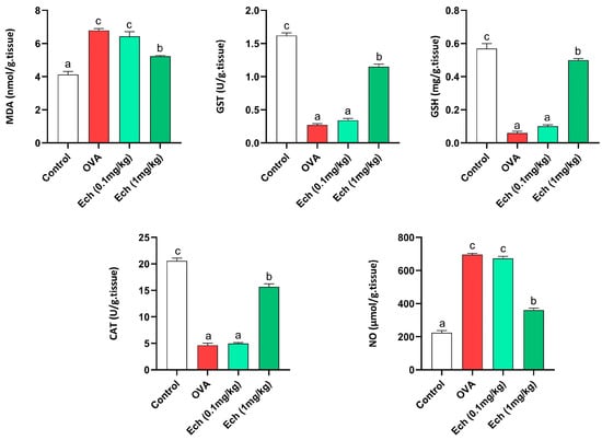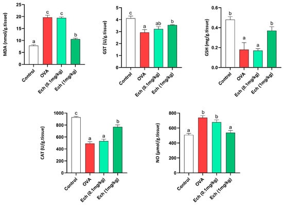 Data concerning spleen antioxidants and oxidative stress markers (MDA, NO, GSH, GST, and CAT) are shown in Figure 13. The MDA, GSH, and NO levels were elevated in the OVA group. Moreover, the activity levels of GST and CAT were diminished in the OVA group. Intraperitoneal injection of 0.1 mg/kg Ech showed no significant change in the OVA-challenged group. However, 1 mg/kg Ech treatment notably diminished their levels (p < 0.05) compared to the OVA-challenged mice.