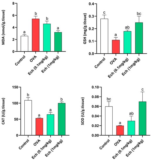 Data concerning liver antioxidants and oxidative stress markers such as MDA, GSH, CAT, and SOD are shown in Figure 12. MDA and GSH were elevated in the OVA group compared to the control. Furthermore, the activity of CAT and SOD was reduced in the OVA group. Treatment with 0.1 mg/kg Ech showed no significant change in the OVA group. However, 1 mg/kg Ech treatment significantly decreased their concentrations compared to the OVA-challenged group (p < 0.05).