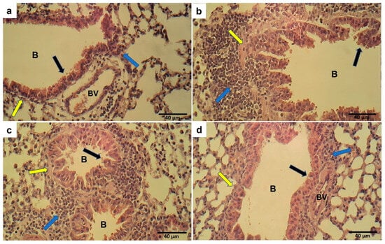 Lung sections of the control group (a) showed normal bronchi (B) with average epithelial lining (black arrow), average airway smooth muscles (yellow arrow), and minimal infiltrating immune cells (blue arrow). Sections from a mouse in the OVA group showed thickness in the bronchial epithelium (black arrow) and smooth muscle (yellow arrow) with marked infiltrating inflammatory cells (blue arrow) (b). Moderate cell infiltration, bronchial epithelium, and smooth muscle thickness were noticed in the 0.1 mg/kg Ech-treated group (c). Mild cell infiltration and average airway epithelium and smooth muscle were observed in the 1 mg/kg Ech-treated mice (d).