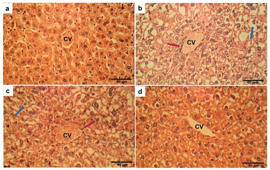 The control group (a) showed normal liver histology. Sections from a mouse in the OVA group (b) showed marked cytoplasmic vacuolation (blue arrow) with inflammatory cell infiltrations around the central vein (CV) (red arrow). Mild immune cell infiltration and vacuolation were noticed in the 0.1 mg/kg Ech-treated group (c). Normal liver tissue structure was observed in the 1 mg/kg Ech-treated mice (d).
