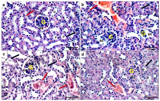 Kidneys from mice in the control group (a) showed normal-sized glomeruli (G) with average Bowman’s spaces (BS), proximal tubules (P) with average epithelial lining and preserved brush borders (black arrow), average distal tubules (D), and average interstitial blood vessels (red arrow). Sections from a mouse in the OVA group showed small-sized glomeruli with widened Bowman’s spaces, proximal tubules with scattered apoptotic epithelial lining and preserved brush borders, average distal tubules, and mildly congested interstitial blood vessels (b). No changes were observed after 0.1 mg/kg Ech treatment (c). Ameliorated kidney structure was observed in the 1 mg/kg Ech-treated mice (d).
