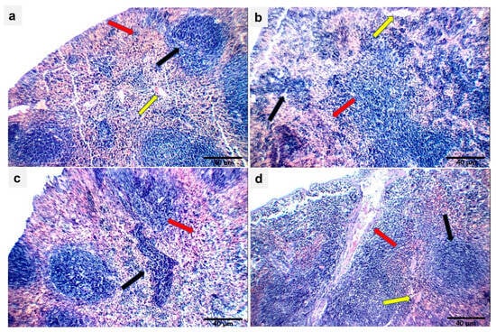 Sections of the spleens of mice in the control group (a) showed normal lymphoid follicles (white bulb) (black arrow), normal blood sinusoids (red bulb) (red arrow), and normal blood vessels (yellow arrow). Sections from a mouse in the OVA group showed small-sized lymphoid follicles (white bulb) (black arrow), expanded blood sinusoids (red bulb) (red arrow), and average blood vessels (yellow arrow). (b) Small-sized lymphoid follicles (black arrow) and markedly expanded congested blood sinusoids with many giant cells (red arrow) were observed after treatment with 0.1 mg/kg Ech. (c) Normal lymphoid follicles (white bulb) (black arrow), average blood sinusoids (red bulb) (red arrow), and mildly congested blood vessels (yellow arrow) were observed after treatment with 1 mg/kg Ech (d).