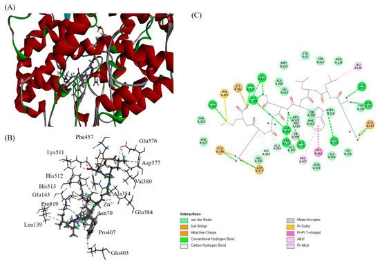 | GVP-7 | ALRPKF | −670.681 | Glu162, His353, Ala354, Ser355, Ala356, His383, Glu384, His387, Phe391, His410, Glu411, Asp415, Asp453, Lys511, Phe512, His513, Ser516, Val518, Tyr523, Phe527, Zn2+ |