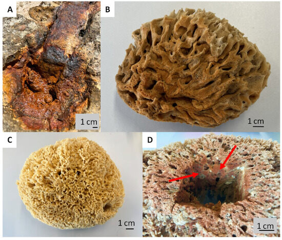 Corrosion of artificial iron-based tools after contact with seawater: (A) remains to be the main source of iron ions in the aquatic environment surrounding the bath sponges. This leads to the development of a well-visible rusty coloration (B) due to the presence of the lepidocrocite mineral phase tightly attached to the organic spongin. A natural skeleton isolated from the marine demosponge Hippospongia communis growing with the absence of iron ions (C) is yellowish in color. This kind of iron-based biomineralization is also detectable deep within the sponge skeleton ((D), arrows).