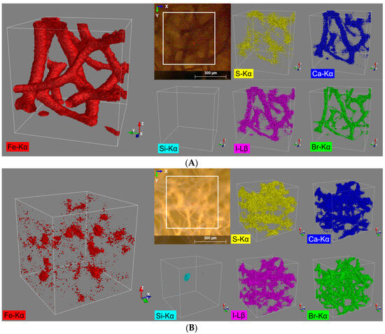 3D distribution images of the elements S (Kα), Ca (Kα), Fe (Kα), Br (Kα), and I (Lβ) within an analysis volume of 500 µm × 500 µm × 500 µm of the (A) spongin with naturally formed lepidocrocite and (B) pure spongin (control).
