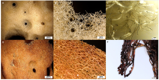 Marine sponges are a resourceful provider of a large diversity of biologically active compounds and biological materials, including chitin and spongin [1,2]. Proteinaceous spongin in the form of 3D porous network-like scaffolds is recognized as a renewable marine biomaterial due to its ability of selected demosponges (mostly bath sponges) to grow under marine ranching conditions [3]. It consists mainly of protein-derived collagen of still unknown type [4], a significant amount of sulfur (up to 5%) similar to keratins, unique halogenated amino acids, xylose, as well as traces of calcium carbonates and silica [5,6,7,8]. This biopolymer is characterized by a complex hierarchical structure based on interconnected nano- and micro-fibers [9,10,11,12]. Such a composition gives this marine biomaterial special resistance to a wide range of acids and enzymes as well as specific structural and mechanical features [13]. Consequently, there are numerous fields of spongin’s applications in the form of ready-to-use scaffolds, including tissue engineering and biomedicine [14], as well as bioinspired material science [15,16,17,18].