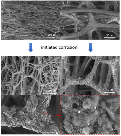 SEM images of iron-free spongin fibers with both lower (A) and higher (B) magnifications (scale bars represent 200 µm and 50 µm, respectively) (see also Figure 2A–C) drastically differ from that obtained after “Iron-Spongin” 3D composite, where the formation of crystalline phase (C–F) (scale bars represent 200 µm, 50 µm, 20 µm, and 4 µm, respectively) remains to be well visible even after ultrasonic treatment. (F) Arrows show needle-like crystals.