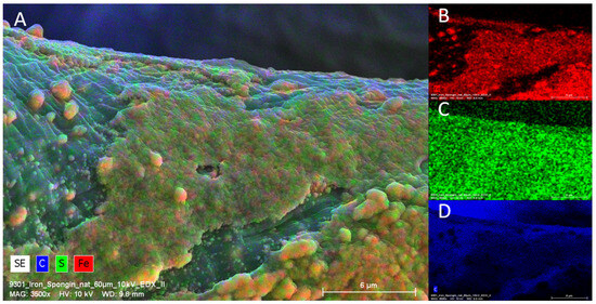 EDX Analysis (elemental mapping) of a single fiber of an “Iron-Spongin after ultrasound treatment” sample. Clearly visible is the presence of Fe and S on the surface of the scaffold strain (A). Fe is predominantly deposited in the crust-like structure (B), whereas sulfur is more or less equally distributed over the surface (C). C is present on the whole sample due to the organic compounds of the sample and of carbon coating used for SEM (D).