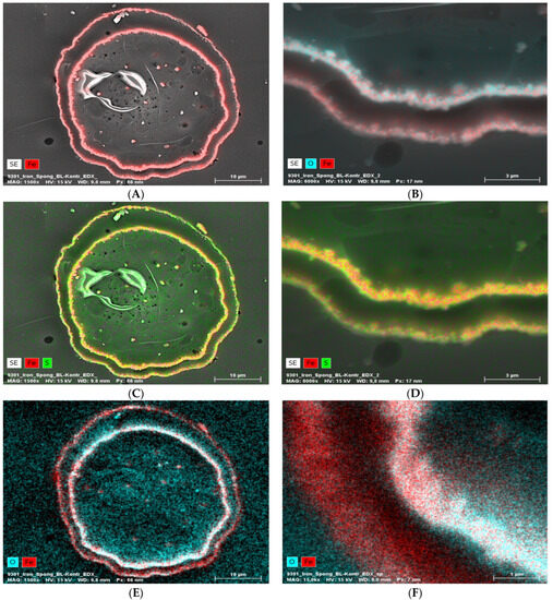 EDX analysis (elemental mapping) of a block face image cross-section of a single “Iron-Spongin after ultrasound treatment” fiber, whereby the element contents are colored in red for iron, blue for oxygen, and green for sulfur (in the case of red and green overlapping, a bright yellow color is observed). The presence of Fe and O in the two layers (A,B,E,F) is clearly visible. Sulfur seems more or less equally distributed over the cross-section (C,D). The inner layer seems to be higher in Fe and O combined with the outer layer (B,E,F).