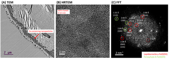 HR-TEM analysis was used to confirm the presence of crystalline phase as lepidocrocite in the “Iron-Spongin after ultrasound treatment” sample. Figure 8A shows a cross-section of a selected section of the composite fiber with lath-like Fe-containing nanoparticles forming conglomerates inside the outer shell of the spongin fiber. This indicates the effective binding of the iron-containing phase to spongin during biomimetic-initiated corrosion under laboratory conditions. The HR-TEM image shows that the particles consist of several nanocrystallites with crystallite sizes of 3–5 nm (Figure 8B). The calculated FFT of the HR-TEM image of the “Iron-Spongin after ultrasound treatment” sample consists of discrete diffraction spots of randomly oriented nanocrystals, reflecting the fine crystallinity of the particles (Figure 8C). An analysis of the reflections indicates that the majority of the particles can be attributed to the orthorhombic lepidocrocite phase (Amam space group [36] or Cmcm [49]). There are also interplane separations of 1.55 Å, 2.64 Å, and 2.66 Å consistent with the (110) and (100) planes of hexagonal feroxyhyte [50]. It is an unstable aqueous iron oxide that transforms spontaneously into goethite and is usually formed under high-pressure conditions on the ocean grounds [51]. For example, according to Vacelet and co-workers, lepidocrocite and a small amount of goethite are minerals that occur in the natural iron-rich skeletons of spongin-based Spongia officinalis marine demosponges [46].