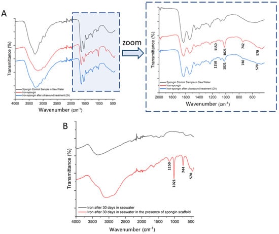 FTIR spectra of the samples: (A) spongin control sample and “Iron-Spongin after ultrasound treatment” along with an approximation in the range of 2000–420 cm−1; (B) iron powder after 30 days insertion into seawater with and without the presence of spongin scaffold.
