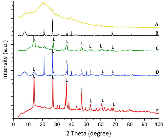 The X-ray diffraction pattern of spongin under study is similar to that reported previously [15,22,24]. The treatment of spongin samples with iron powder using artificial seawater (see Section 4) causes the appearance of reflection characteristics for that of lepidocrocite [56], which confirms that this mineral phase is formed during the preparation of the “Iron-Spongin” composite. Further data analysis confirms the formation of lepidocrocite on both the “Iron-Spongin” sample and on “Iron-Spongin after ultrasound treatment”. This is indicated by the peaks present in the XRD graphs of these samples at ~14°, ~27°, ~38°, ~47°, ~53°, ~61°, and ~68°, which correspond to the (020), (120), (111), (020), (151), (231), and (251) crystal planes, respectively (Figure 10). These peaks correspond to polymorphs of the iron oxyhydroxide lepidocrocite (γ-FeOOH) [57]. For comparison, a diffractogram of iron powder (Figure 10E) obtained after 30 days in seawater in the presence of spongin with lepidocrocite-characteristic reflections is included.