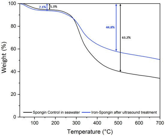 The thermal degradation of a control spongin sample in seawater and “Iron-Spongin after ultrasound treatment” was studied. Two weight losses occur during the thermal degradation of both samples (Figure 11). The first, a weight loss of about 5–8% in the 70–150 °C range, is related to the evaporation of physically adsorbed and hydrogen-bonded water from the spongin scaffold [12]. The second weight loss in the temperature range of 230–450 °C is about 63.2% for the control sample and about 44.8% for “Iron-Spongin after ultrasound treatment”. This may be related to the decomposition of the protein matrix: the disintegration of the peptide bonds [12,25], and thermal degradation of disulfide bonds [12,58] and hydrogen bonds [12]. In the “Iron-Spongin after ultrasound treatment” material, the thermal stability is higher than that of the control spongin sample. The difference in thermal stability can be attributed to the formation of bonds between spongin and iron and electrostatic interactions formed between the hydroxyl groups of spongin and lepidocrocite [29].