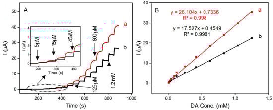 (A) Amperograms recorded in 0.1 M phosphate buffer pH 6.5 with the successive addition of DA (5 μM to 1.3 mM) at (a) N-Iron-Sp/CPE, and (b) B-Iron-Sp/CPE. (B) Calibration curve for the linear response of current vs. DA concentration.