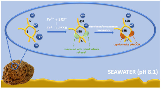 The possible mechanism of lepidocrocite formation on spongin fibers may be associated with spongin amino acid sequences, including cysteine, histidine, lysine, or tyrosine [7,8]. Functional groups derived from amino acids (e.g., –SH, –OH, –NH2, and –COOH) [22] and the presence of electron donor atoms (O, N, S) result in the ability to form complexes with iron ions [88]. A large group of Fe-S clusters of proteins is known; in most cases, the terminal ligands attached to iron are derived from thiol groups from cysteinyl residues [89,90,91,92]. Therefore, it is possible that cysteine/cysteine sulfur is involved in the formation of an iron-based crystalline mineral phase in spongins. Iron is a transition metal with well-known redox and ligand-binding properties [93]. It is capable of accepting and donating electrons, transitioning between the ferric (Fe3+) and ferrous (Fe2+) forms [94]. In seawater at pH 8.1, the Fe2+ form is rapidly oxidized to the Fe3+ form, so it exists mainly in the form of iron(III) oxyhydroxide, which has a very low solubility and a thermodynamically stable oxidation state [95,96,97,98]. Cornell and Schneider [99] demonstrated that in the presence of cysteine at pH 8.0, a fast transformation of non-crystalline iron(III) hydroxide into mainly crystalline lepidocrocite with a small amount of goethite occurs. Alkaline seawater conditions affect the surface chemistry of spongin—cysteine-derived thiol groups (SH–), which are converted to thiolate anions (RS–) [100]. Then, the interaction between cysteine and non-crystalline iron(III) hydroxide involves the oxidative dehydration of cysteine, which can form disulfide bonds (S–S) to produce cysteine [101,102]. There is also a concomitant reduction in some interfacial ferric sites, transforming the solid iron phase into a compound with mixed-valence Fe2+/Fe3+. This compound dissolves more readily than the starting material, and the dissolution/precipitation mechanism then leads to more thermodynamically stable iron mineral phases, such as lepidocrocite (Figure 14) [103,104,105].
