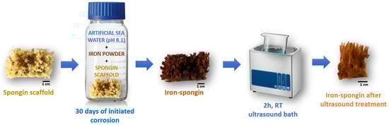 Schematic overview of the preparation of “Iron-Spongin” material using iron powder in artificial seawater with pH 8.1 at 24 °C.