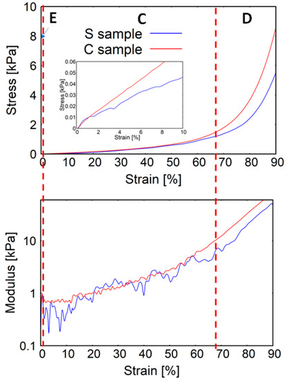 Stress–strain and modulus–strain curves of the investigated A. aerophoba sponge scaffolds. Three distinctive stages of compression were indicated: E—elastic stage, C—collapse stage, and D—densification stage. S samples (blue) correspond to bromotyrosine-containing samples and C (red) corresponds to bromotyrosine-free samples.