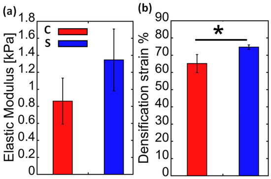 Comparison of elastic modulus (a) (compression) (MPa) and (b) densification strain (%) of bromotyrosine-containing (S, blue) and bromotyrosine-free (C, red) chitinous scaffolds isolated from A. aerophoba demosponge. * p < 0.05.