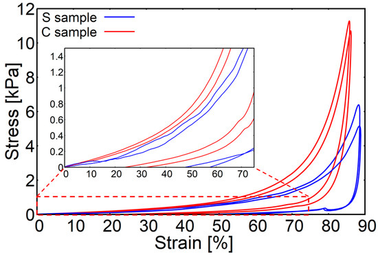 The elastic moduli characterising the samples were determined (Figure 3a). The elastic modulus of the S (bromotyrosine-containing) samples is slightly higher than that of the C (bromotyrosine-free) samples; however, the difference remains to be statistically non-significant. The collapse stages of C and S samples look distinctively different. The modulus–strain curve of the C sample is much smoother than in the case of the S samples. One can see that the stress notably increased when both samples of the scaffolds were compressed to more than 60% strain, which may indicate the densification stage presence. The smoothness of the tangent modulus–strain curves more explicitly manifests the densification of the scaffolds under study (Figure 2). One can see from Figure 3b that in the case of the C samples, the densification strain is significantly lower than in the case of the S samples. In Figure 4, stress–strain hysteresis curves are presented. Both of the investigated specimen groups were permanently distorted; however, they still had some residual ability to reshape. It is worth emphasizing that in the case of the S samples, the deformation is irreversible to a greater extent than in the case of the C samples (Figure 4), which could suggest that a significant number of sponge-like struts of S samples lost their continuity.