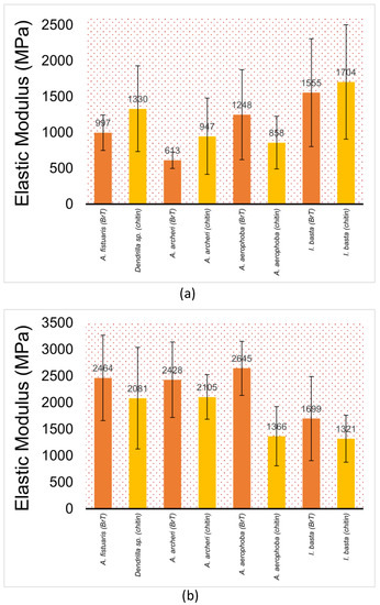 Elastic modulus (nanoindentation) in megapascals (MPa) of (a) 10 µm sections; (b) 1 µm sections of selected demosponges under study (from left to right: A. fistularis, Dendrilla sp., A. archeri, A. aerophoba, Ianthella basta) ± standard deviation. “BrT” denotes bromotyrosine-containing (orange). “Chitin” denotes sponge samples where bromotyrosines have been chemically removed (yellow).