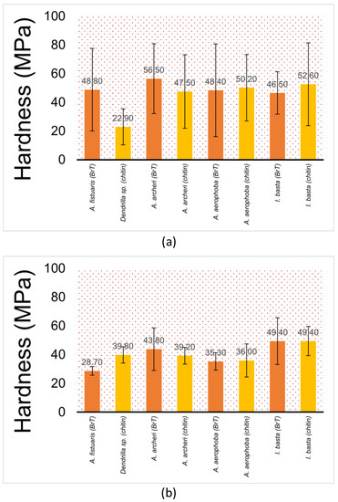Furthermore, another interesting phenomenon is observed: the hardness of sponge chitin samples that have undergone alkali treatment is relatively unchanged, which is a clear form of evidence that this kind of fibrous chitin is solely responsible for the material hardness observed in the samples studied. On the other hand, bromotyrosines in the skeletal chitinous fibres of the investigated sponges enhance their elasticity; however, they do not significantly contribute to their hardness. This can be explained by either the O-linked glycosylation bonding of bromotyrosines or hydrogen-bonding between chitin and bromotyrosines, or a mixture of both. Nonetheless, such a hypothesis would require future studies and confirmation by Nuclear Magnetic Resonance (NMR) spectroscopy.