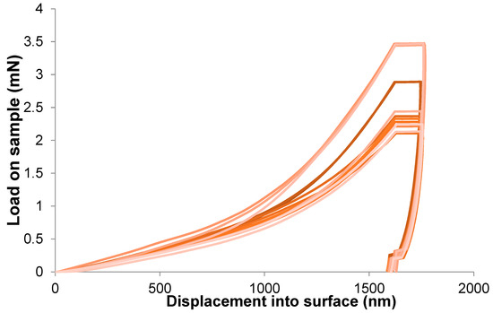 The value of the elastic modulus changes between samples by about four times, and the hardness value of the hardest sample (i.e., A. archeri.) is about 60% higher than for the sample with the lowest hardness (i.e., Dendrilla sp.) (Figure 6). This can be influenced by the dispersion of fibre sizes and the natural way of formation. Moreover, examining the fibres from a single sample, we observed significant scatter in the results between them. The standard deviations of the arithmetic mean have values ranging from 20 to 50% of the measured value. This is due to the high inhomogeneity of the tested material. Figure 7 presents a summary of the nanoindentation hysteresis curves for one type of sample (several A. aerophoba fibres).