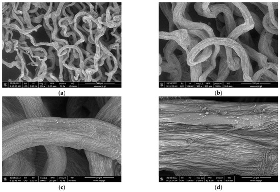 Figure 8 shows SEM images of mechanically pressed chitinous A. aerophoba sponge fibre samples at different magnifications: ×200, ×500, ×2000, and ×5000. The fibres exhibit random orientation and have a tendency to curve. Signs of shrinkage due to drying are visible. The average fibre diameter is around 59 ± 25.1 µm and varies greatly across a single fibre due to dehydration and uneven shrinkage. The porosity of the analysed samples was determined to be around 60% (pore size: 225 ± 96 µm).