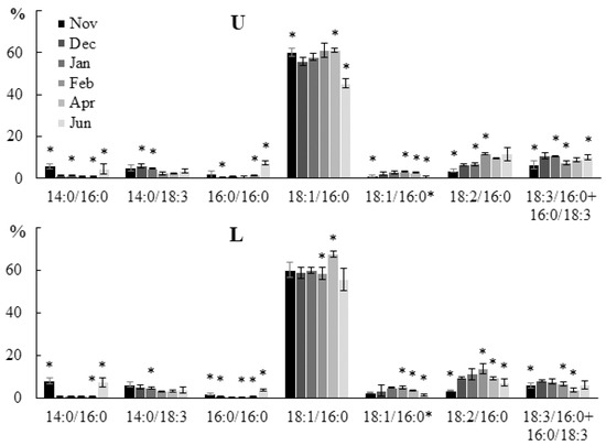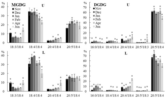 | DGTS | 47 | 18:4/16:0, 18:3/16:0, 16:1/14:0, 18:4/14:0, 18:2/14:0, 16:1/16:0, 18:3/18:1, 18:1/18:1 |