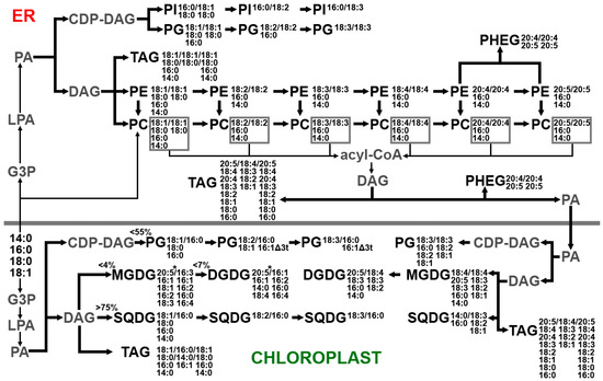 - Bates, P.D.; Ohlrogge, J.B.; Pollard, M. Incorporation of Newly Synthesized Fatty Acids into Cytosolic Glycerolipids in Pea Leaves Occurs via Acyl Editing. J. Biol. Chem. 2007, 282, 31206–31216. [Google Scholar] [CrossRef]