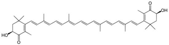 Astaxanthin (3,3′-dihydroxy-beta, beta-carotene-4,4′-dione, Figure 1) is a xanthophyll carotenoid and is categorized as a lipophilic carotenoid.