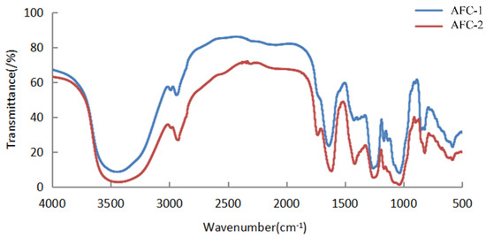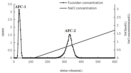 The separation of AN-FUC using the Diethylaminoethyl (DEAE)-Sepharose Fast Flow anion exchange column is illustrated in Figure 1. Two distinct fractions, AFC-1 and AFC-2, were obtained. AFC-1 was eluted with water, while AFC-2 was eluted with an increasing salinity of the mobile phase. The symmetrical peaks observed in the chromatography indicate a relatively high purity of the two fractions. The carbohydrate content, sulfate content, and monosaccharide composition of each fucoidan fraction are summarized in Table 1. AFC-2 exhibited the highest carbohydrate content, while AFC-1 had the highest sulfate content. The dominant monosaccharides in both fractions were fucose and xylose, with small amounts of mannose, glucose, rhamnose, galactose, and glucuronic acid also detected.