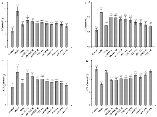 Male Kunming mice weighing 20 ± 2 g were obtained from the Animal Experimental Center of Dalian Medical University (Dalian, China). The mice were acclimated to the laboratory environment for 7 days prior to the commencement of the experiment. The mice were housed under controlled conditions of 12-h light/dark cycle at a temperature of 25 ± 2 °C. Standard diet and water were provided to all animals throughout the acclimation period. The mice were randomly divided into twelve groups, each consisting of eight individuals. The groups were as follows: low-dose AN-FUC, AFC-1, and AFC-2 group were administered 100 mg/kg·d of AN-FUC, AFC-1, and AFC-2, respectively; medium-dose AN-FUC, AFC-1, and AFC-2 groups were administered 200 mg/kg·d of AN-FUC, AFC-1, and AFC-2, respectively; and high-dose AN-FUC, AFC-1, and AFC-2 groups were administered 400 mg/kg·d of AN-FUC, AFC-1, and AFC-2, respectively. Both the control group and the model group received saline. The drug group received atorvastatin calcium tablets through gavage at a dose of 5 mg/kg·d. Except for the control group, all other groups were fed a high-fat diet.