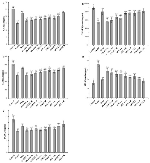 Effects of fucoidan on CAT, GSH-PX, SOD, MDA and POD levels of mice liver tissue. (A): CAT; (B): GSH-PX; (C): SOD; (D): MDA; (E): POD. Values are expressed as the means ± standard deviation (n = 8). **: p < 0.01 compared with the model group; *: p < 0.05 compared with the model group; ##: p < 0.01 compared with the control group; #: p < 0.05 compared with the control group; △△: p < 0.01 compared with the drug group, △: p < 0.05 compared with the drug group.
