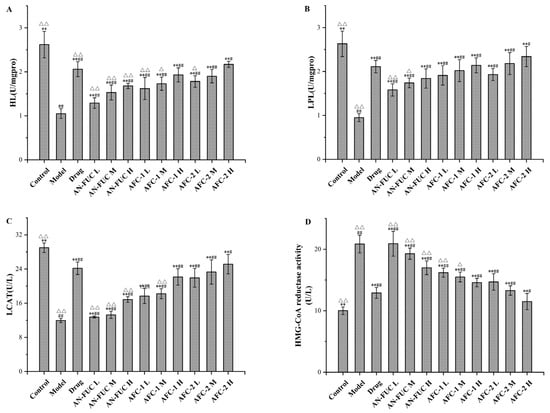 Effects of fucoidan on HL, LPL, LCAT and HMG-CoA reductase activity levels of mice live tissue. (A): HL; (B): LPL; (C): LCAT; (D): HMG-CoA reductase activity. Values are expressed as the means ± standard deviation (n = 8). **: p < 0.01 compared with the model group; ##: p < 0.01 compared with the control group; #: p < 0.05 compared with the control group; △△: p < 0.01 compared with the drug group, △: p < 0.05 compared with the drug group.