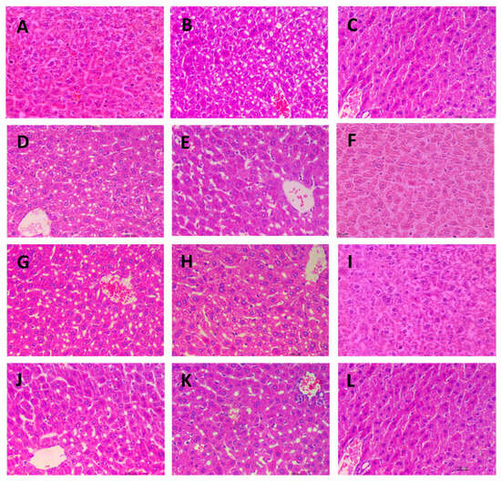 Microscopic images of liver tissues stained with Hematoxylin-Eosin (400×). (A): Control group; (B): Model group; (C): Drug group; (D): AN-FUC-L group; (E): AN-FUC-M group; (F): AN-FUC-H group; (G): AFC-1-L group; (H): AFC-1-M group; (I): AFC-1-H group; (J): AFC-2-L group; (K): AFC-2-M group; (L): AFC-2-H group.