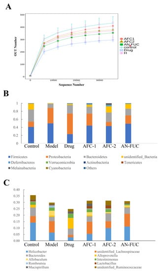 Dilution curve (A) of the high-throughput sequencing of the gut flora and relative abundance at phylum level (B) and genus level (C).