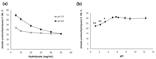 Effect of hydrolysate concentration (a) and pH (b) on the solubility. * Significantly different at p < 0.05. ** Significantly different at p < 0.01.